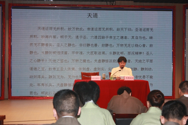 2012年6月26日晚,合肥市廬陽工業(yè)區(qū)合肥天方茶藝館內(nèi),偌大的教室里,50多位各個年齡層次的人都如古人般坐于蒲團上,面容沉靜,正全神聆聽對面一位同樣端坐于蒲團上的老師講課,老師講解的是《莊子》,“是故內(nèi)圣外王之道,暗而不明,郁而不發(fā)……”