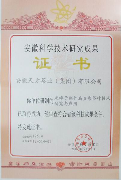 9月2日,由安徽天方茶業(yè)(集團(tuán))有限公司自主研發(fā)的“米棒子制作扁直形茶葉技術(shù)研究與應(yīng)用”項(xiàng)目通過(guò)安徽省科技廳組織的科技成果鑒定。該項(xiàng)目研究選用柔軟的米棒子替代傳統(tǒng)的硬棒子,具有噪音小、制作成本低、使用方便、成茶品質(zhì)好、碎茶率低、效益高等優(yōu)點(diǎn)。并獲得國(guó)家專利一項(xiàng)。