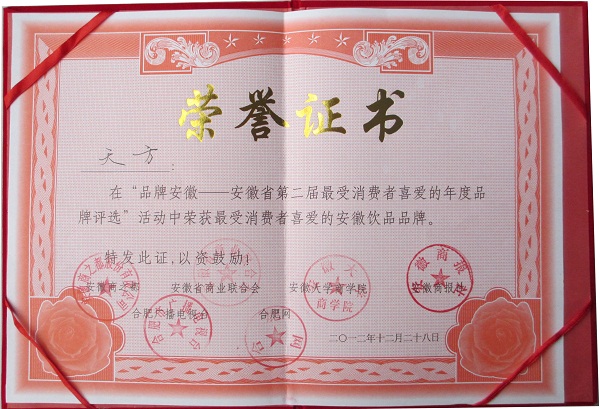 由安徽商之都、安徽省商業(yè)聯(lián)合會、安徽大學商學院、安徽商報社、合肥電視臺、合肥網(wǎng)及活動支持單位安徽省商務品牌促進辦公室在2012年歲末聯(lián)合推出的“品牌安徽——2012安徽省第二屆最受消費者喜愛的年度品牌評選”結(jié)果于2012年12月27日正式揭曉,80個行業(yè)標桿品牌脫穎而出,當選安徽年度優(yōu)秀品牌。“天方”品牌憑借其在消費者中良好的美譽度和行業(yè)中的影響力,在本次活動中榮獲“最受消費者喜愛的安徽飲品品牌”榮譽稱號。(王焱/文 高翠鵑/圖)