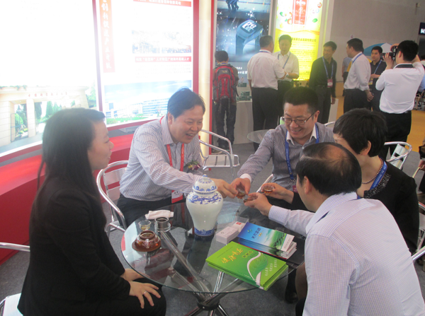 圖為:安徽代表團(tuán)團(tuán)長(zhǎng)及成員正在品茶