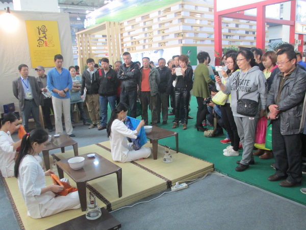 (大家在天方展位前觀看茶熏瑜伽茶藝表演)