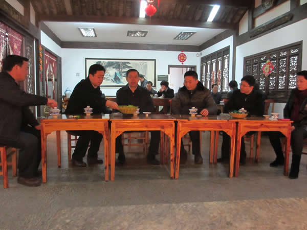 天方總經(jīng)理鄭小平給鄭牧民一行匯報企業(yè)發(fā)展情況并介紹古黟黑茶系列產(chǎn)品及天方茶業(yè)在2014年首推的“茶馬票”。