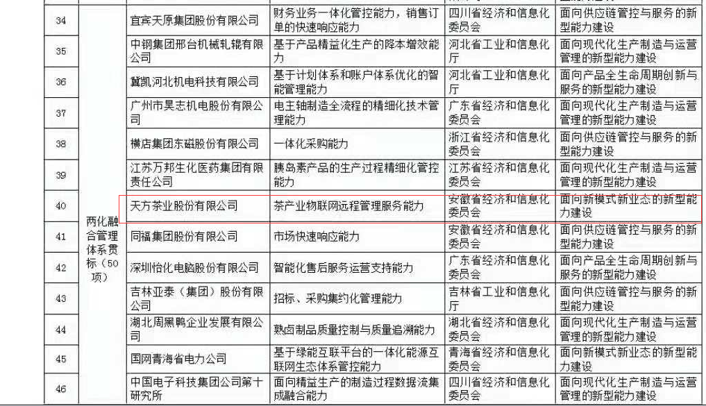 天方茶業(yè)股份有限公司 2015年入選安徽省兩化融合管理體系貫標(biāo)試點(diǎn)企業(yè),2016年入選國(guó)家兩化融合管理體系貫標(biāo)試點(diǎn)企業(yè),2017年通過(guò)兩化融合體系認(rèn)證,本次獲得工信部2018年試點(diǎn)示范榮譽(yù),這是企業(yè)轉(zhuǎn)型升級(jí)的重大機(jī)遇。