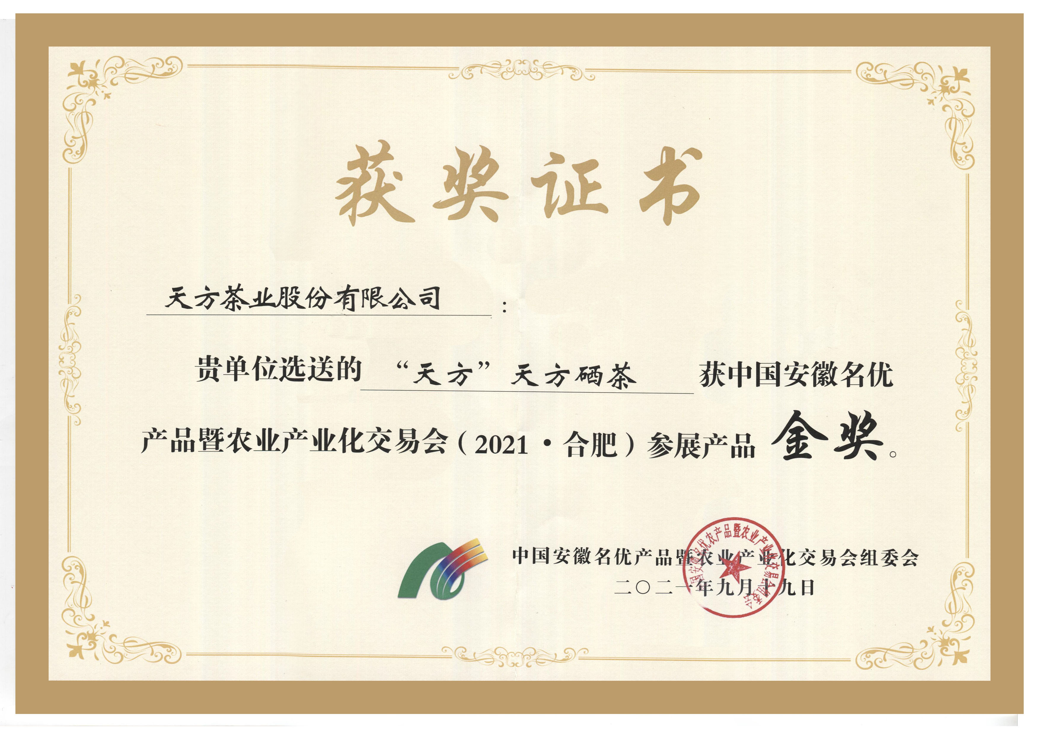 天方硒茶榮獲中國安徽名優(yōu)產(chǎn)品暨農(nóng)業(yè)產(chǎn)業(yè)化交易會(huì)(2021·合肥)參展產(chǎn)品金獎(jiǎng)