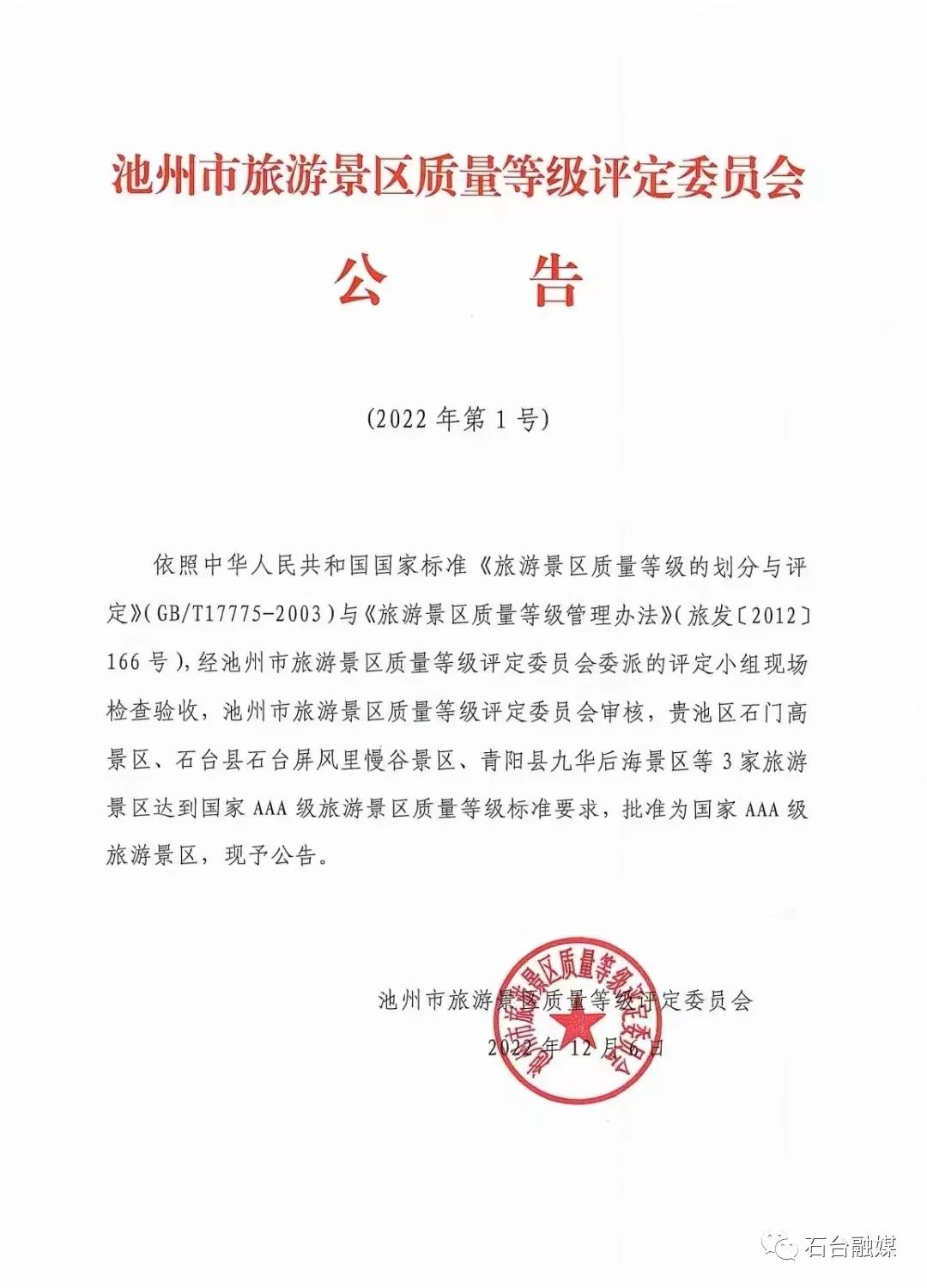 近日,經(jīng)《池州市旅游景區(qū)質(zhì)量等級(jí)評(píng)定委員會(huì)公告(2022年第1號(hào))》,批準(zhǔn)石臺(tái)縣石臺(tái)屏風(fēng)里慢谷景區(qū)正式成為國(guó)家3A級(jí)旅游景區(qū)。