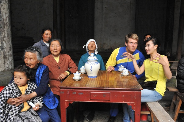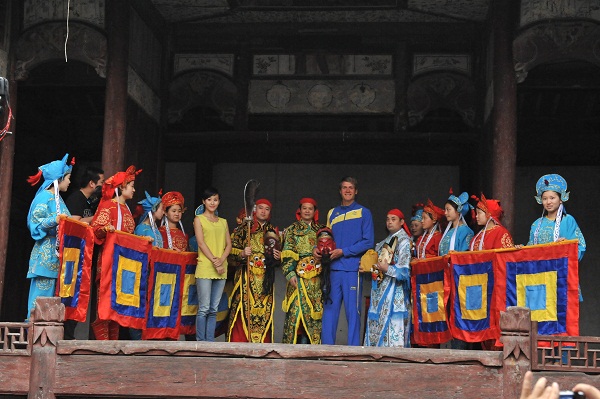 這里一座建于明代的古戲臺,天光從天井里照射下來,給古戲臺蒙上了一層柔光。戲臺上,數(shù)十名農(nóng)民正演著儺舞《打赤鳥》,鑼鼓聲聲,戲臺下,觀眾看得如癡如醉。馬克思•薩米能在當?shù)厝说膸椭拢趹蚺_下的八仙桌旁,品著茶,看著戲,聽著一旁翻譯講解劇情,其實,翻譯不說他也能領(lǐng)會大概情節(jié)。“這樣古老的藝術(shù)真難得一見啊!” 馬克思•薩米能感嘆道。待到演出結(jié)束,他走到戲臺上,興奮地請求與這些農(nóng)民演員合影留念,并向他們詢問一些關(guān)于儺戲的問題。當?shù)弥R克思•薩米能是奧運會冠軍時,這些農(nóng)民演員也非常高興,也向他打聽起那遙遠的國度里的事情來。他們談得非常融洽,馬克思•薩米能于是說起他父親交待給他的任務(wù)來,“你們知道誰是最值得擁 有這塊沉船古瓷的人嗎?”儺戲演員中的一位老者立即說,“哎呀,我覺得有一個人最值得擁有它!”